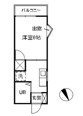 間取 | 1K 19.40㎡洋6畳・K2畳・バルコニー・UB・ミニキッチン・室内洗濯機置場・押入・下駄箱・シャッター |